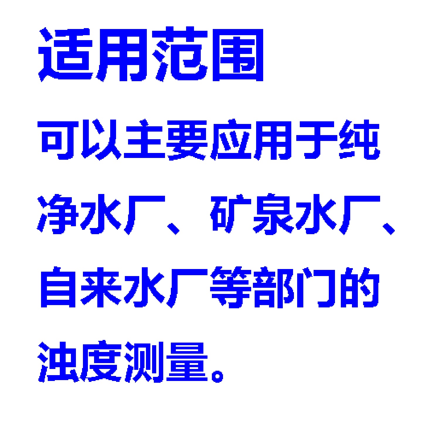 用于测量悬浮于水或透明液体中不溶性颗粒物质所产生的光的散射程度,并能定量表征这些悬浮颗粒物质的含量。可以主要应用于纯净水厂、矿泉水厂、自来水厂等部门的浊度测量。