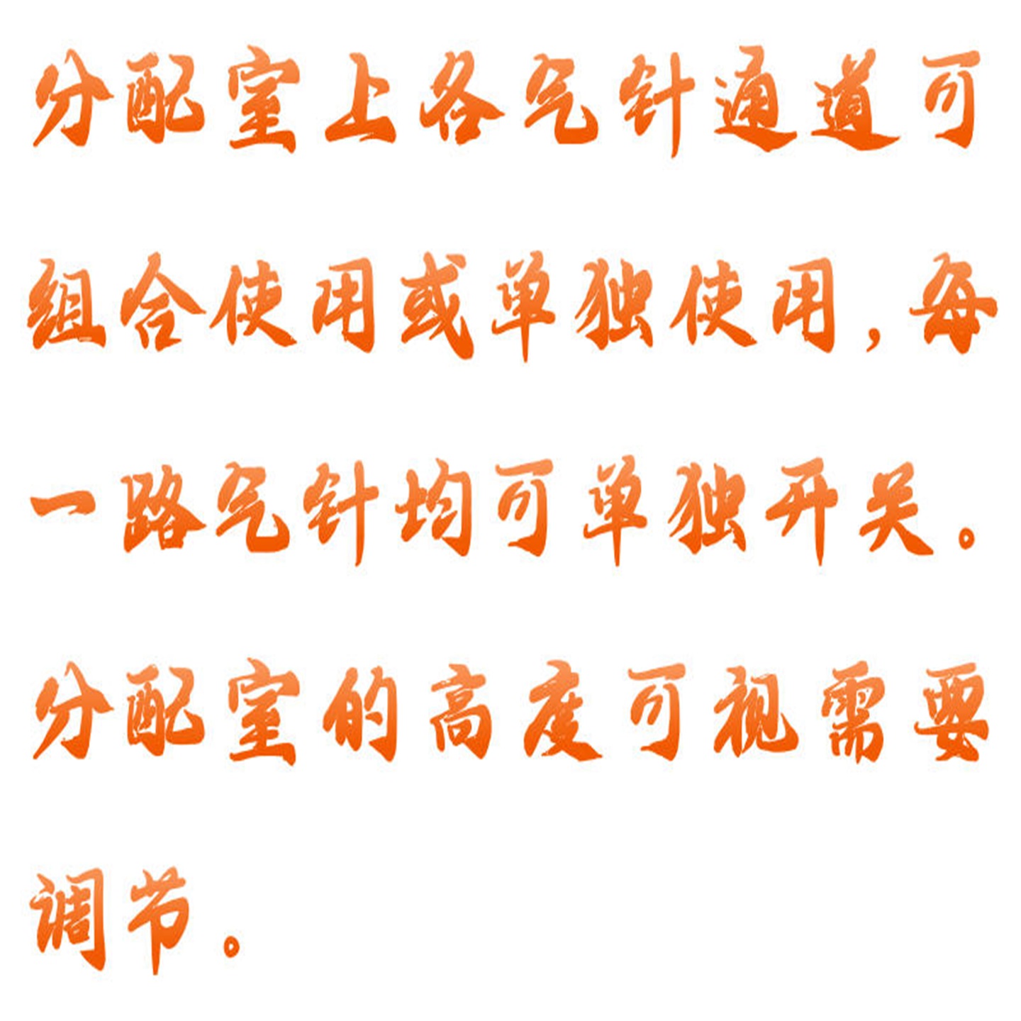 1、分配室上各气针通道可组合使用或单独使用,每一路气针均可单独开关。分配室的高度可视需要调节。