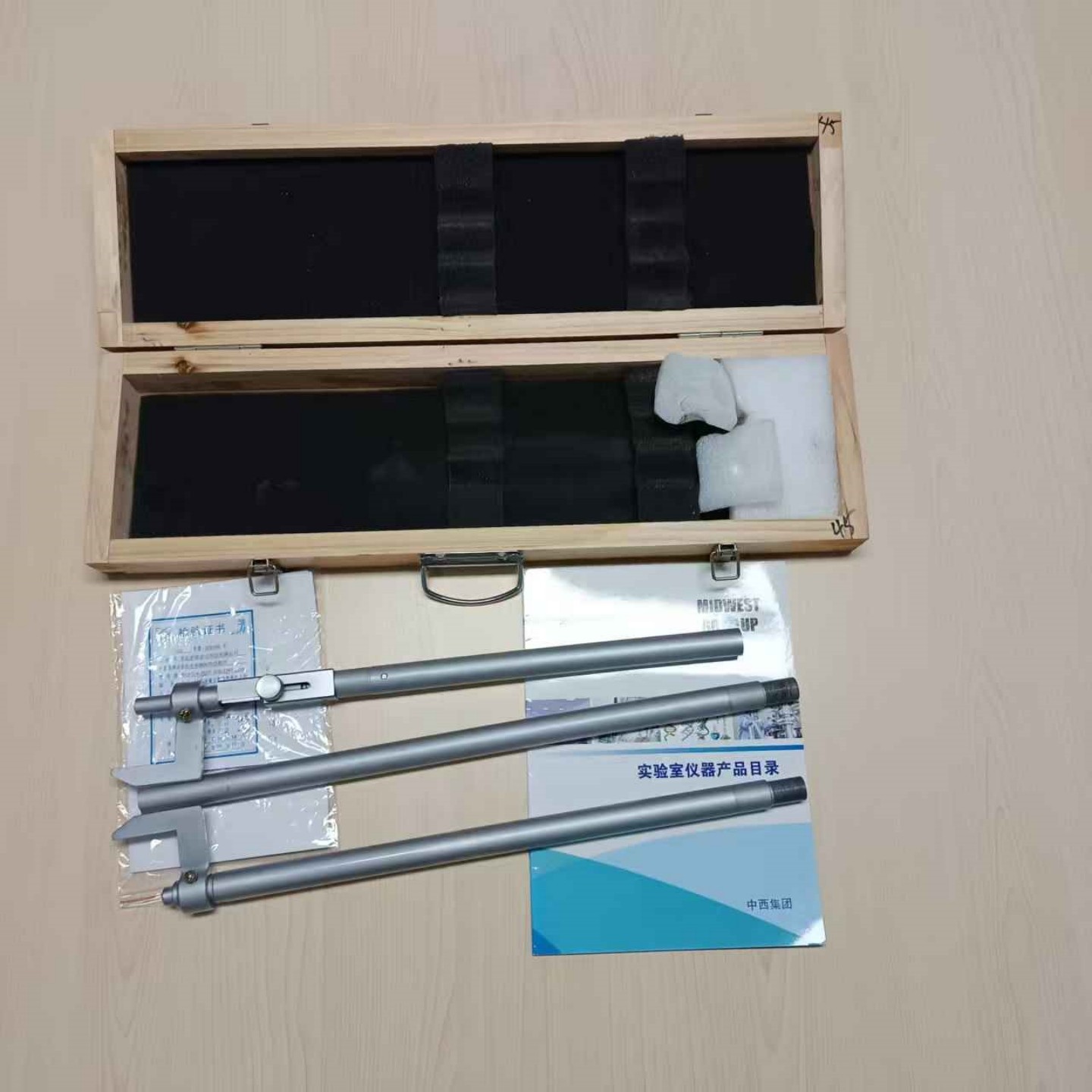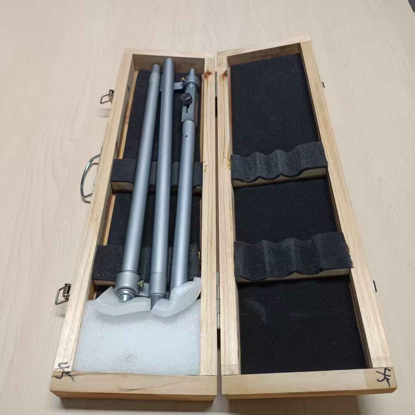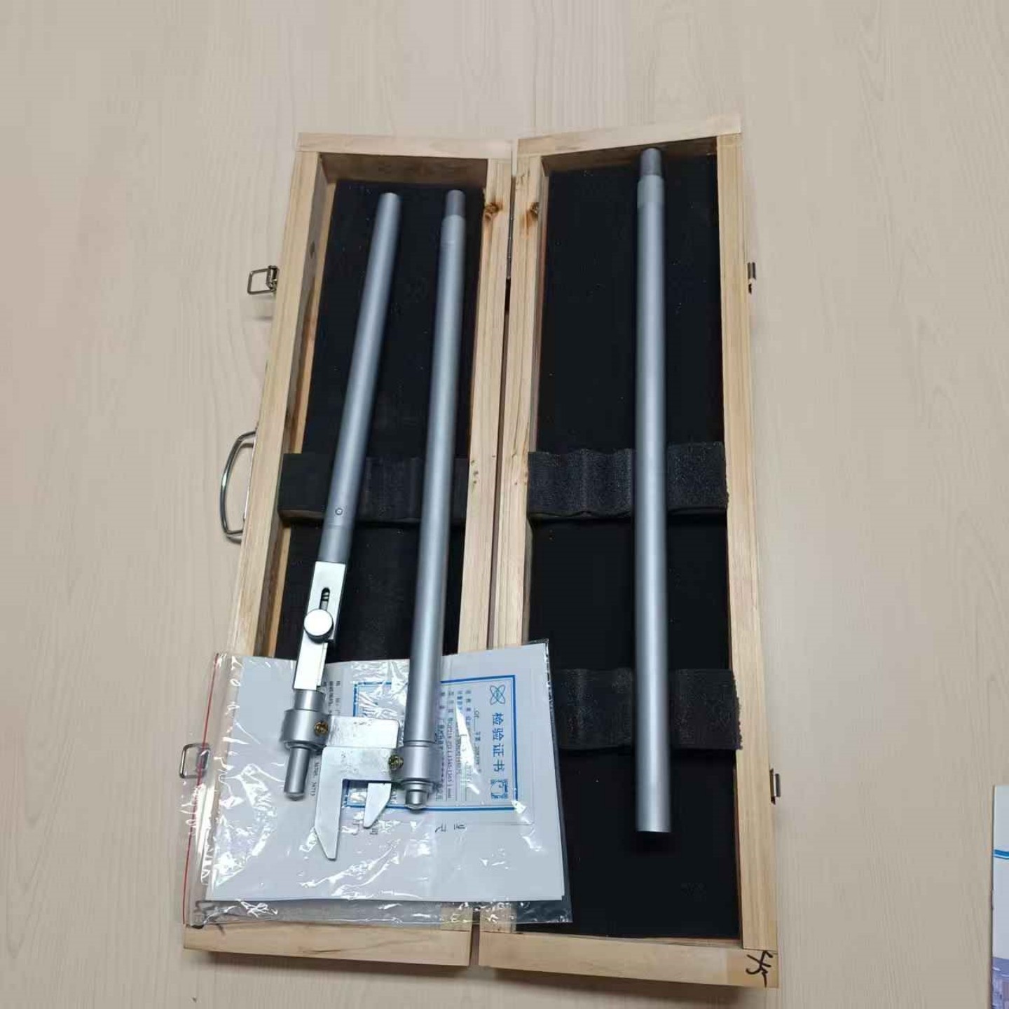 使用前将拆成两节放置箱内的内距尺通过螺纹联接为一体(注意:须拧紧),其余操作步骤同一体式内距尺。