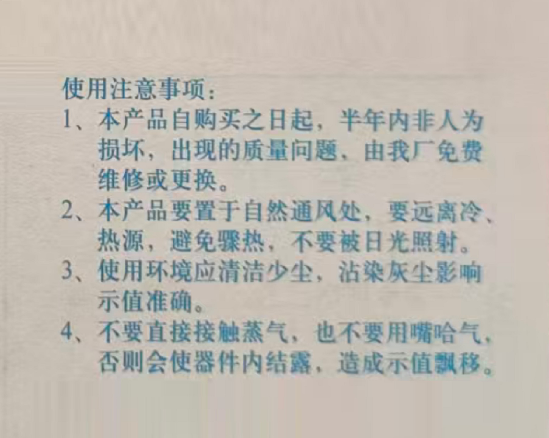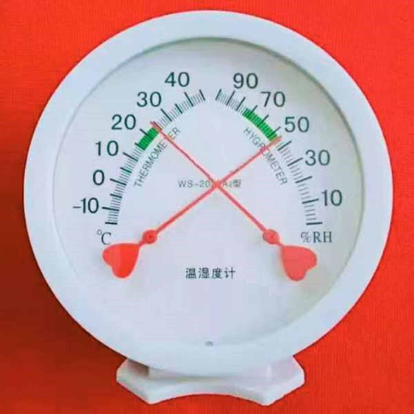 温湿度表 型号:2020-A2 尺寸:直径13.1cm 台式壁挂2用 温湿度表是温度、湿度、(计*时)、二(三)位一体,实用方便,计量准确,耐老化、使用时间长等特点。 温湿表主要应用于实验室、养殖业、仪器仪表车间、图书室、、电脑微机房等。 一、测量范围 温度:-10℃-50℃ 湿度:10%RH~90%RH 二、技术指标 温度:-10℃以下±2℃/-10C-40℃±1.5℃/±40℃以上±2℃ 湿度:45%RH以下±10%RH/45%RH-75%RH±7%RH/75%RHRH以上±10%RH 计*时精度:±1秒/日 / 1.5VCC / 25℃ 三、使用注意事项: 1、本产品自购买之日起,半年内非人为损坏,出现的质量问题,可维修或换。 2、本产品要置于自然通风处,要远离冷、热源,避免骤热,不要被日光照射。 3、使用环境应清洁少尘,沾染灰尘影响示值准确。 4、不要直接接触蒸气,也不要用嘴哈气,否则会使器件内结露,造成示值飘移。 环境温湿度参考值 人体适宜的环境:温度15℃~25℃,相对湿度45%RH~75%RH。 居室环境:40%RH-70%RH 图书馆、美术馆、博物馆40%RH~60%RH 电脑微机房,通讯机房45%RH~60%RH 衣料、棉毛纺织品存放40%RH~60%RH 奶制品存放50%RH~60%RH 水果存放60%RH~70%RH 治病环境30%RH~50%RH