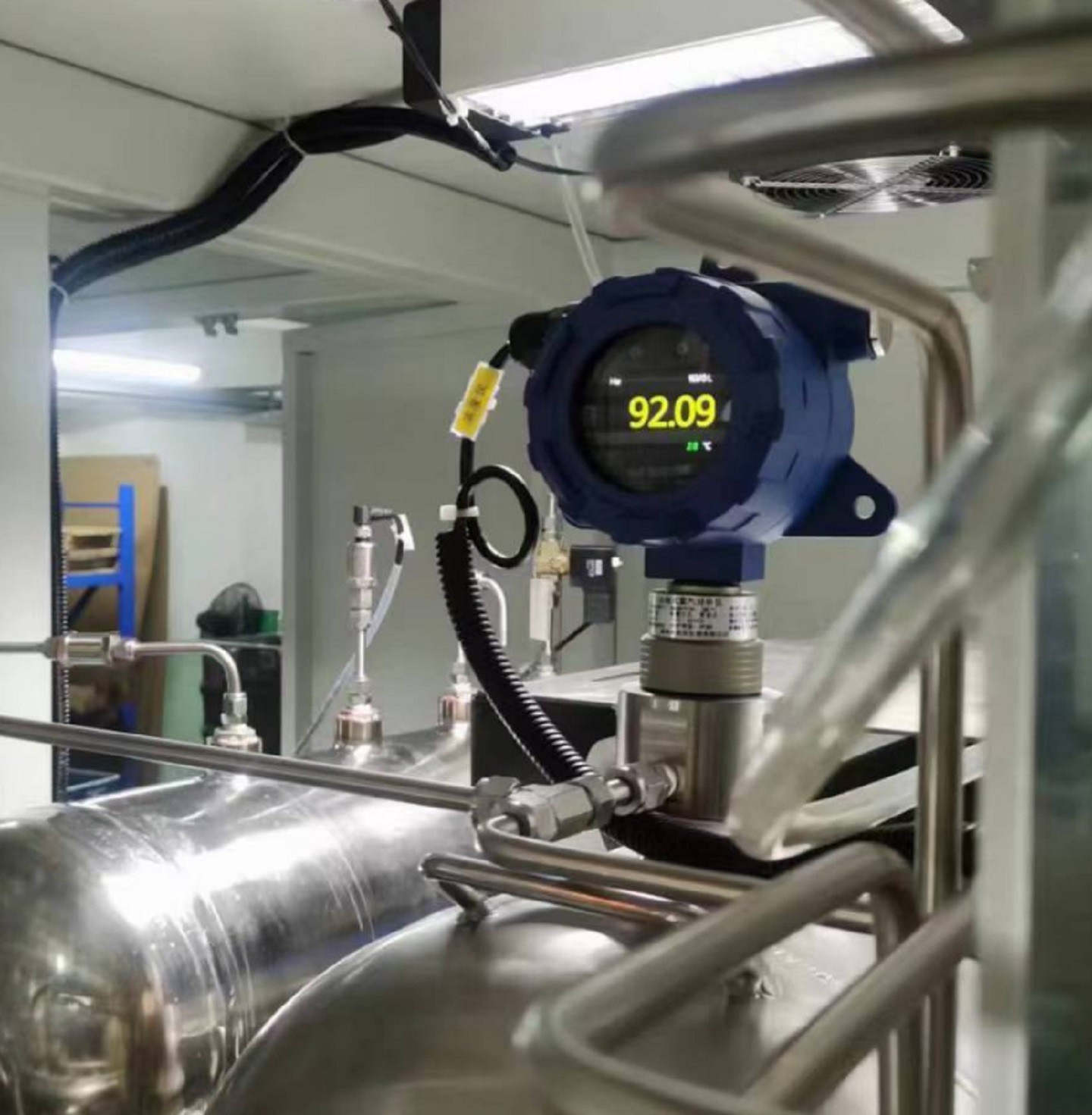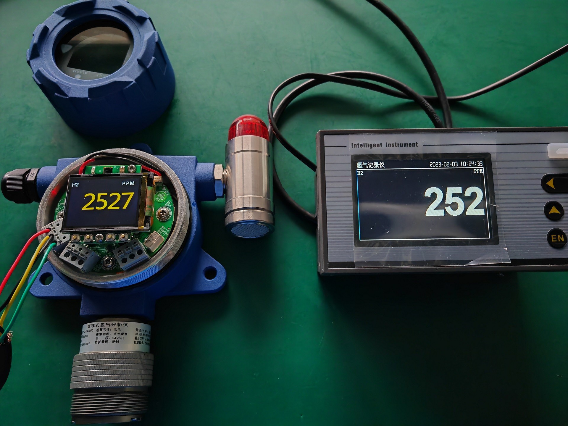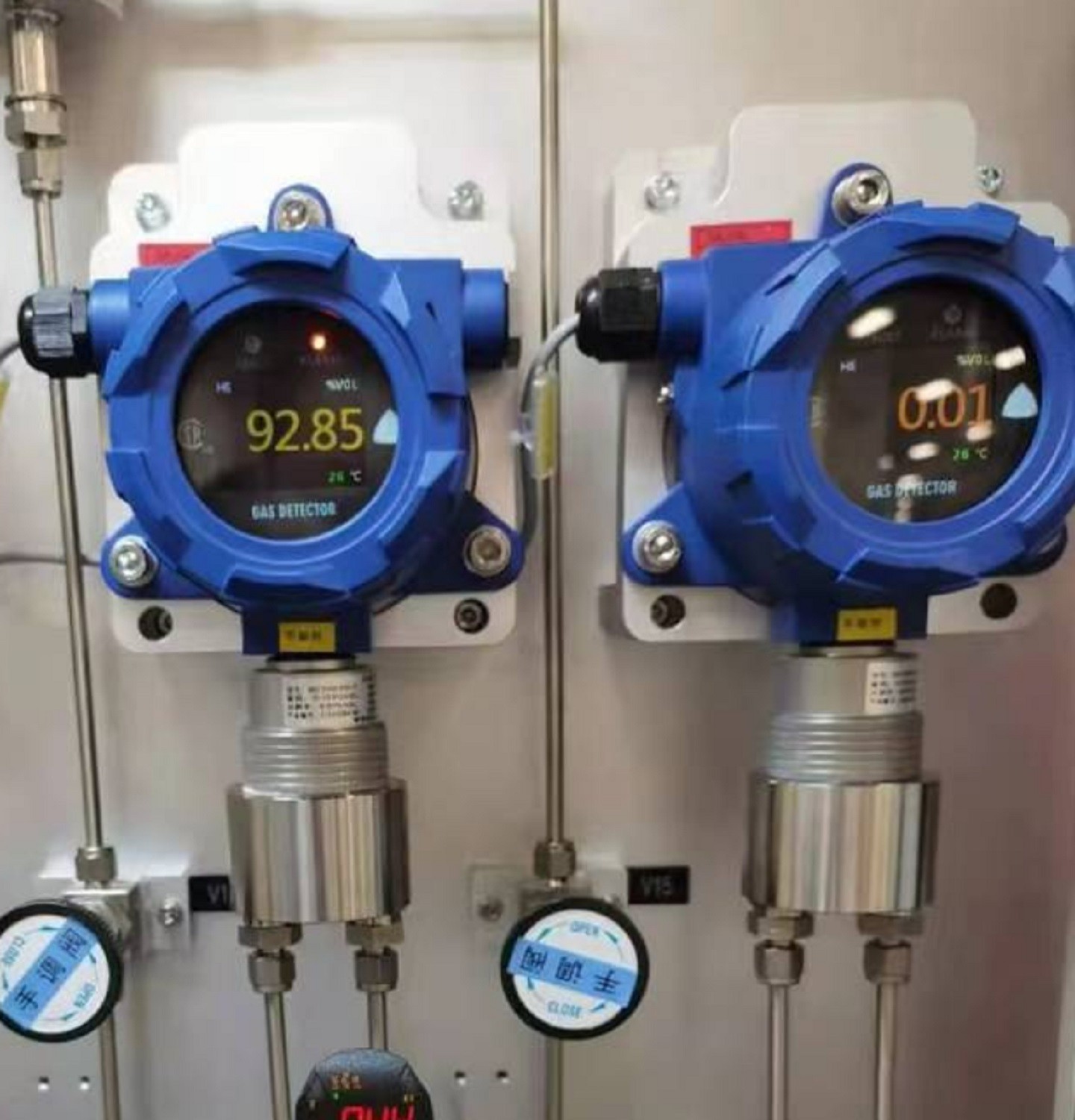 防爆在线氧中氢分析仪 型号:GCT-H2-P31-D-Z库号:M412101 查看hh 在线氧中氢分析仪 型号:GCT-H2-P31-D-Z GCT-H2 在线式氢气分析仪可以同时具有现场检测氢气浓度显示、信号变送、led 灯和继电器报警功 能。在线式氢气分析仪工作原理是将现场检测到的氢气气体浓度,转换为对应的标准信号(如电压信号(如0-5/10V)、电流信号(如 4-20mA)、标准数字信号(如总线 RS-485、RS232)、频率信号、Hart 协议信号,然后将信号变送到 PLC、DCS、报警控制主机等上位机进行统一显示、管理和控制。在线式氢气分析仪内部带有 1 个继电器(开关量信号),可以控制风机、声光报警器、电磁阀等设备。 技术参数 名称:在线氧中氢分析仪 型号:GCT-H2-P31-D-Z 检测气体:氢气H2; 检测原理: 进口电化学; 检测量程:0-40000ppm; 分 辨 率:1ppm; 精 度:±3%FS 响应时间:T90≤30秒 工作温度:-20~50℃; 工作湿度:0~95%(非凝结); 工作压力:大气压±10%; 工作电压:24VDC供电; 防爆等级:Ex d IIC T6 Gb; 输出信号:4-20MA+RS485+继电器; 检测方式:流通式或管道式; 操作方式:红外遥控器智能操作 备注:氧中氢含量监测,要求常压;