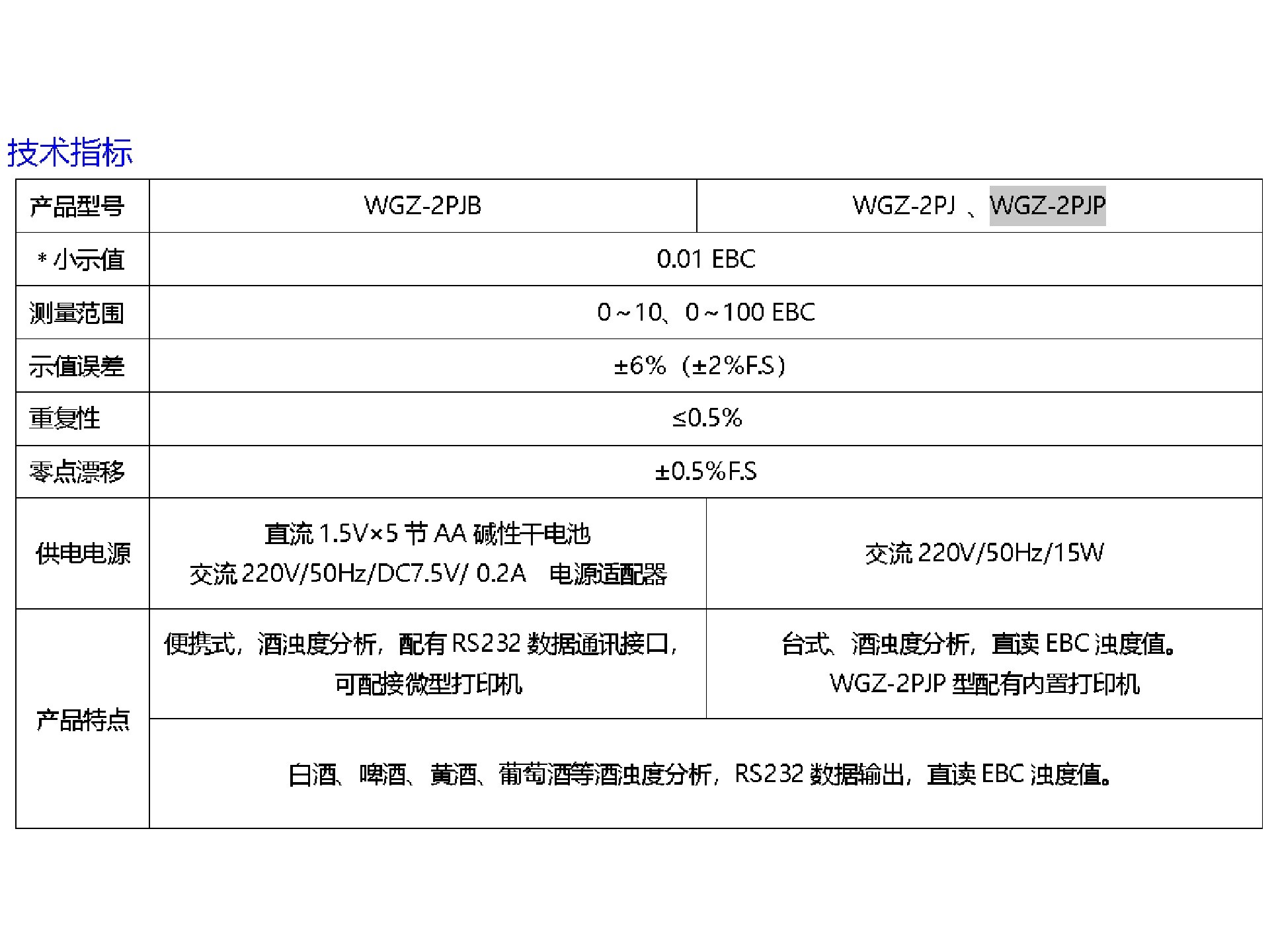 啤酒浊度计库号:M412351 啤酒浊度计(内置打印机) 型号:WGZ-2PJP库号:M412351 查看hh 啤酒浊度计 型号:WGZ-2PJP 用途概述 用于测量悬浮于酒中不溶性颗粒物质所产生的光的散射程度,并能定量表征这些悬浮颗粒物质的含量。该仪器可用于啤酒、黄酒、白酒等酒浊度测定。同时也可以应用于发电厂、纯净水厂、自来水厂、生活污水处理厂、饮料厂、环境部门、工业用水、制酒行业及制药行业、等部门的浊度测量。 产品特点 1.微电脑,触摸式键盘,LCD背光液晶显示屏,标准串行RS232数据通讯接口 2.读数响应自动平衡或在期望的时间间隔内自动采集数据,可稳定读数 3.快捷设置平均测量模式,以短的时间得到正确的数据,可测不稳定水样 4.内置时钟记忆储存系统,能够长期储存和调用近期校正值及测量数据 5.的光路系统,的定位结构,有*效的色度补偿,直读EBC浊度值 6.白酒、啤酒、黄酒、葡萄酒等酒浊度分析,RS232数据输出 技术指标 产品型号:WGZ-2PJB *小示值:0.01 EBC 测量范围:0~10、0~100 EBC 示值误差:±6%(±2%F.S) 重复性:≤0.5% 零点漂移:±0.5%F.S 供电电源:直流1.5V×5节AA碱性干电池 交流220V/50Hz/DC7.5V/ 0.2A 电源适配器 产品特点: 便携式,酒浊度分析,配有RS232数据通讯接口,可配接微型打印机,白酒、啤酒、黄酒、葡萄酒等酒浊度分析,RS232数据输出,直读EBC浊度值。 产品型号:WGZ-2PJ *小示值:0.01 EBC 测量范围:0~10、0~100 EBC 示值误差:±6%(±2%F.S) 重复性:≤0.5% 零点漂移:±0.5%F.S 供电电源:交流220V/50Hz/15W 产品特点: 台式、酒浊度分析,直读EBC浊度值。 WGZ-2PJP型配有内置打印机,白酒、啤酒、黄酒、葡萄酒等酒浊度分析,RS232数据输出,直读EBC浊度值。 产品型号:WGZ-2PJP *小示值:0.01 EBC 测量范围:0~10、0~100 EBC 示值误差:±6%(±2%F.S) 重复性:≤0.5% 零点漂移:±0.5%F.S 供电电源:交流220V/50Hz/15W 产品特点: 台式、酒浊度分析,直读EBC浊度值。 WGZ-2PJP型配有内置打印机,白酒、啤酒、黄酒、葡萄酒等酒浊度分析,RS232数据输出,直读EBC浊度值。